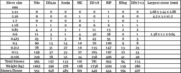 Table 1 - Monument property: Microdiamond recovery from core samples to date: