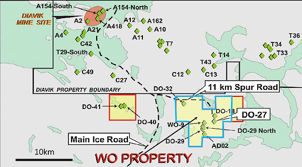 Figure 1 - Location of WO Diamond Property (blue outline) with respect to Diavik Diamond Mine (Modified from Peregrine Diamonds January 2009 Technical Report to reflect updated WO Property)