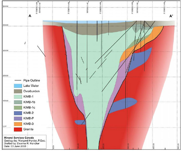 KIMB-3 is a complex unit of volcaniclastic kimberlite that contains several sub-divisions that cannot always be correlated between drill holes. To date, it has been observed only in the northeastern lobe of DO-27 where it comprises approximately 20% of the kimberlite (approximately 2% of the whole body), locally underlying KIMB-1. It is variable in colour from green to black and highly variable in grain size, sorting and xenolith content, with some units (KGB – kimberlite-granite breccia) containing > 30% granite boulders up to 2 m in size. KIMB-P is volcaniclastic, possibly re-sedimented, kimberlite infilling the DO-27 pipe which cannot be further subdivided into KIMB-1 or KIMB-3. It is present in small volumes at the pipe margins in many areas of the kimberlite. It contains variable amounts of dilution, and contains as much as 15% mud as xenoliths and within the matrix. Mineralization within the Project consists of kimberlite intrusions containing diamonds.