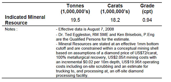 Table 1 contains the NI 43-101 mineral resource estimate on the property as of August 7, 2008. The tonnage reported in Table 1 lies within the Whittle™ resource shell and the modelled KIMB-1 boundary and is reported as undiluted kimberlite only (or partial block tonnes). The tabulation does not include mixed kimberlitic material that occurs between the KIMB-1 and KIMB-P boundary.